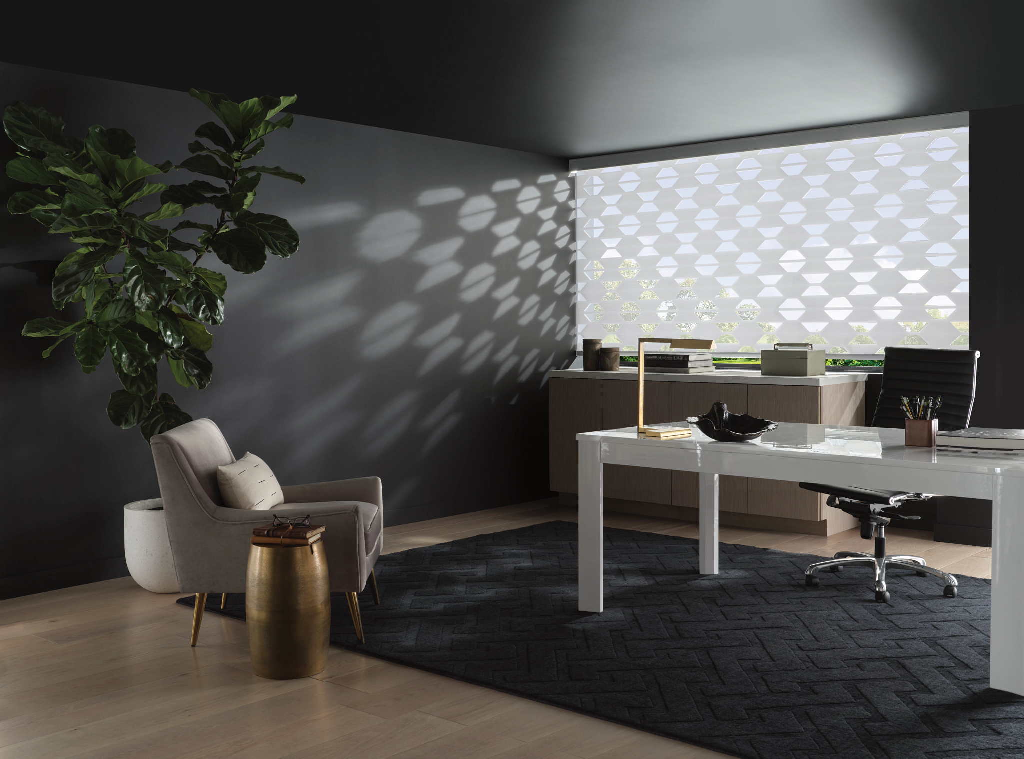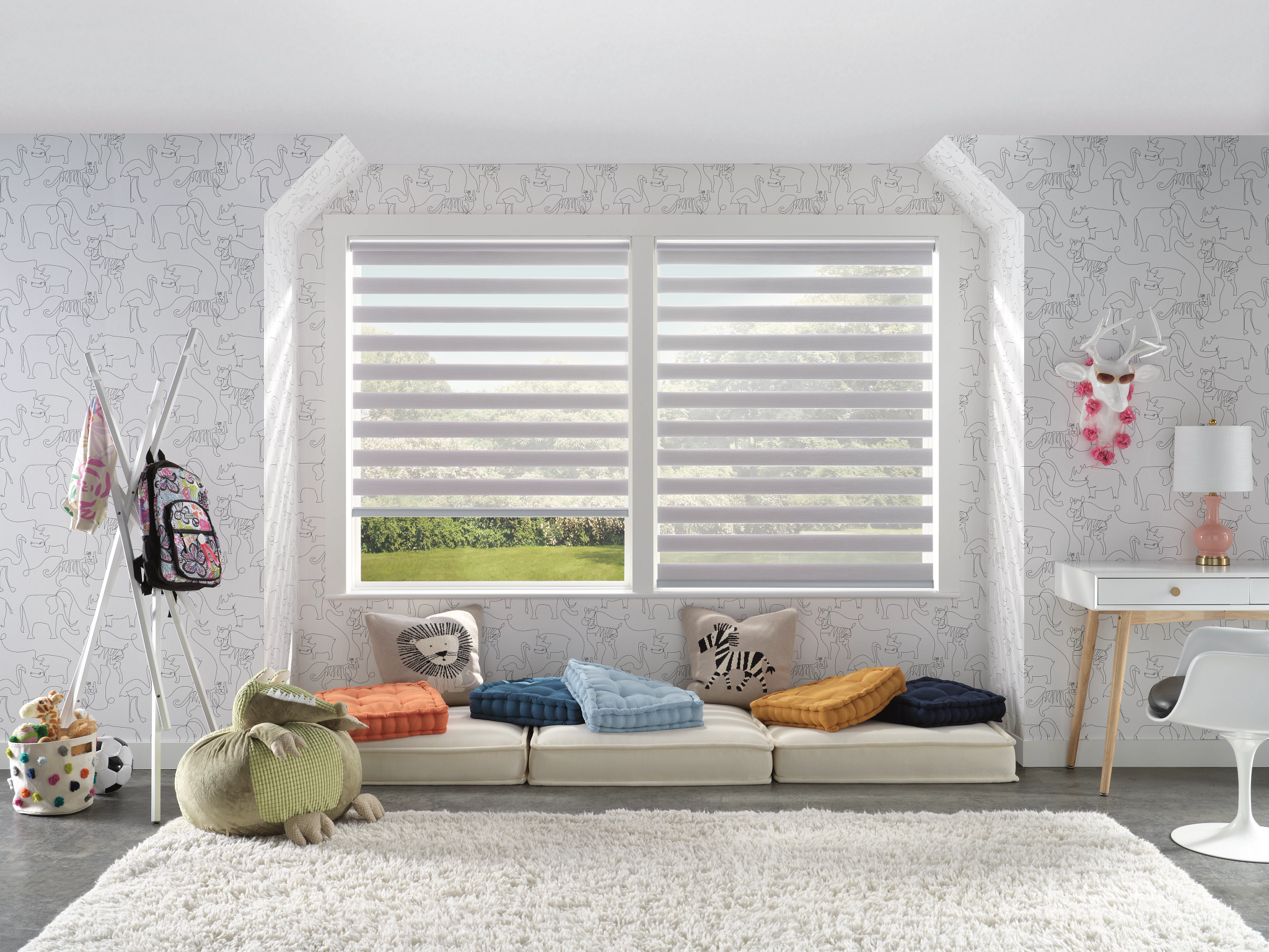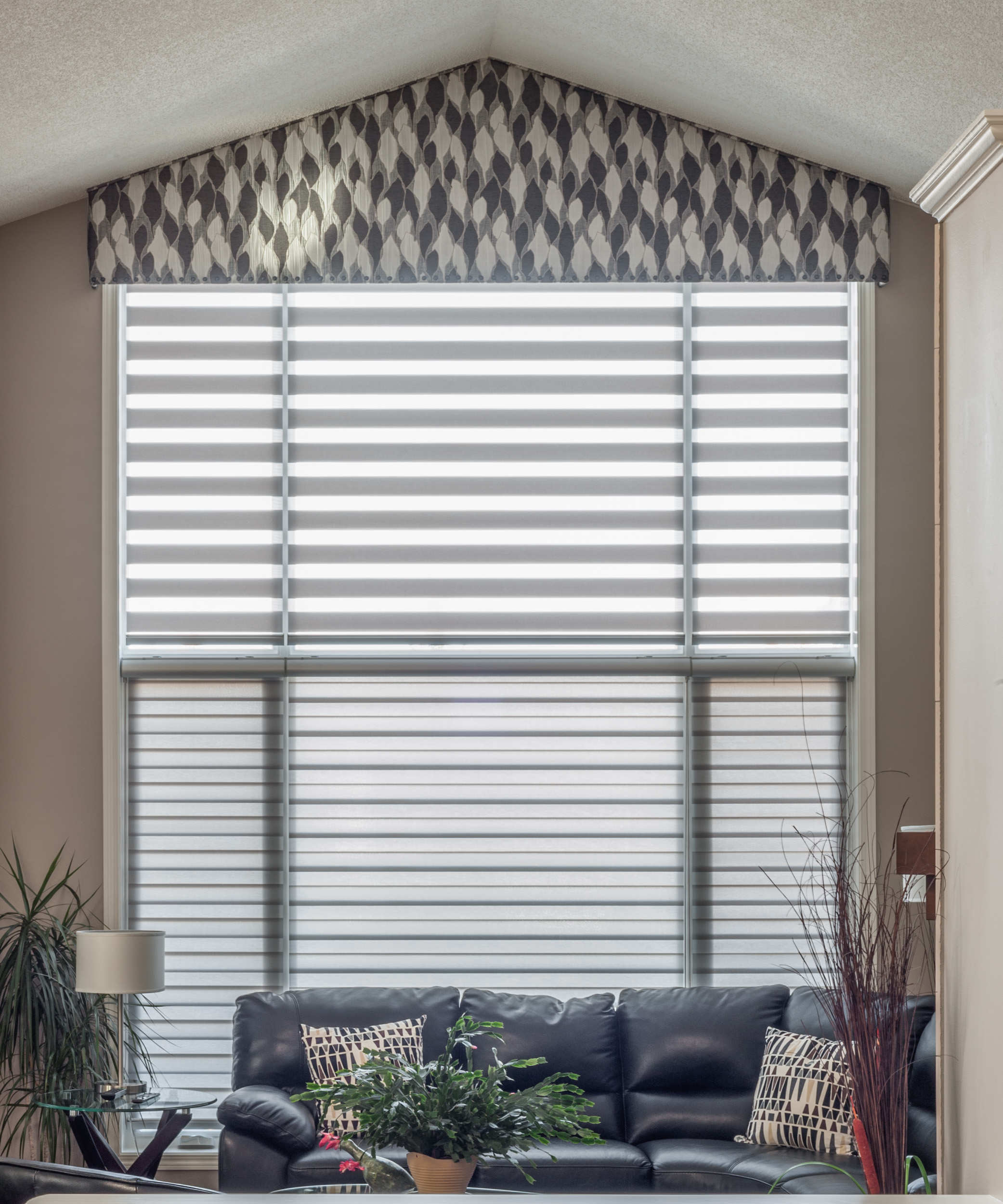 Banded / Zebra shades combine sheer and opaque fabric stripes to give a modern look to roller style shading systems. Their dual or layered design functions as a roller style treatment where one layer passes in front of the other to create varying degrees of privacy on demand. Zebra shades are ideal for larger windows, can be easily motorized & provide excellent light control & UV protection making them a versatile option for any room.