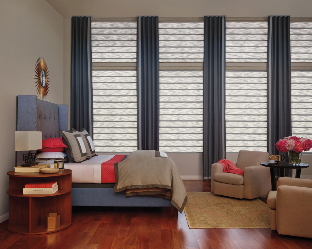 Fabric shades are versatile window treatments that can be made using almost any fabric in a wide range of styles, colors, and functionalities. With the right lining, these shades are extremely energy efficient and exceptional for bedrooms and areas where room darkening is desired. Generally the taller the window, the farther apart the rows of rings are sewn to create larger folds that best suit the scale of the treatment versus the size of the window. Fabric shades are a good companion to drapery where stacking space is not available for some window treatments, but clients want consistency with the fabric across all treatments. At GiCor, our fabric collections include thousands of the latest patterns, textures & colors with manual & motorized options using a variety of control systems.