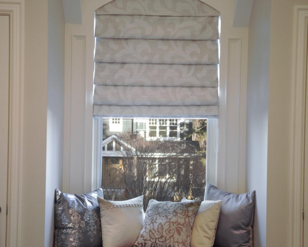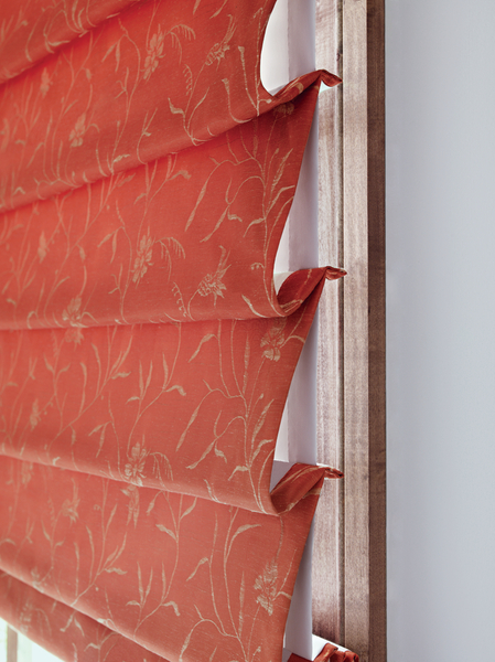 - Roman (flat fold) shades: These shades are typically sewn flat (no pleats) so they hang perfectly straight and showcase the fabric pattern as it comes off the roll. Roman shades stack neatly at the top when raised giving the appearance of a soft folded style valance known as a “mock roman”.