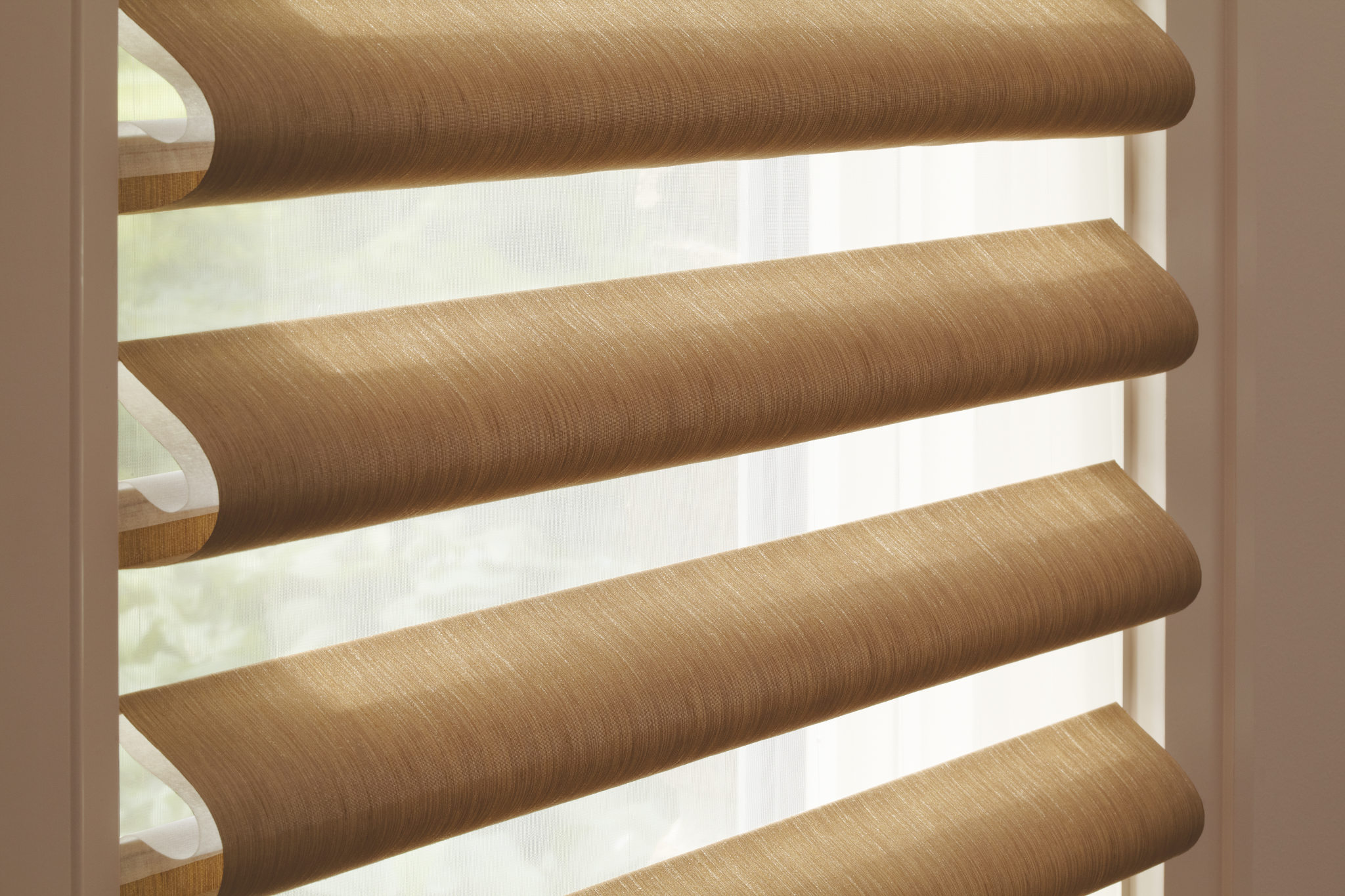 Hunter Douglas Pirouette Shades are a distinctive window treatment that combines the elegance of a fabric shade with the versatility of adjustable vanes. This exclusive Hunter Douglas product is uniquely designed with soft, horizontal fabric vanes attached to a single sheer backing, providing light control in an entirely new way. When fully lowered, it resembles a Roman style shade which beautifully filters the natural light. Gently pull on the operating wand and the fabric vanes expand providing a clear outside view. When fully raised, the shades are hidden behind the integral valance head rail.