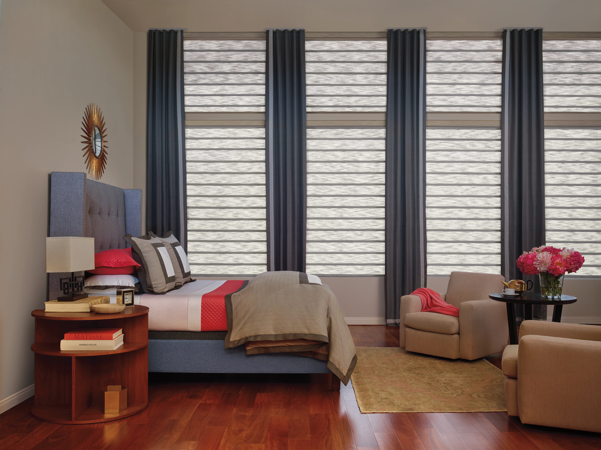 Vignette® Modern Roman shades are another exclusive Hunter Douglas product that is stylish & versatile and known for its soft, elegant look. Vignette shades roll up into a headrail, stack like a roman shade or traverse side to side like a drapery to cover wide windows and doors, (see Luminette Modern drapery). All options are made from the same stunning fabrics for ultimate coordination and child safety. Semi sheer, semi-opaque or if you prefer to block out light altogether, room darkening fabrics are available to make you oblivious to the time of day. The same shade fabrics are also available by the yard to create decorative pillows, valances, drapery panels, or coordinating bed coverings. Vignette® Modern Roman Shades are available in a wide variety of angles, arches, shapes and sizes to fit nearly any window.