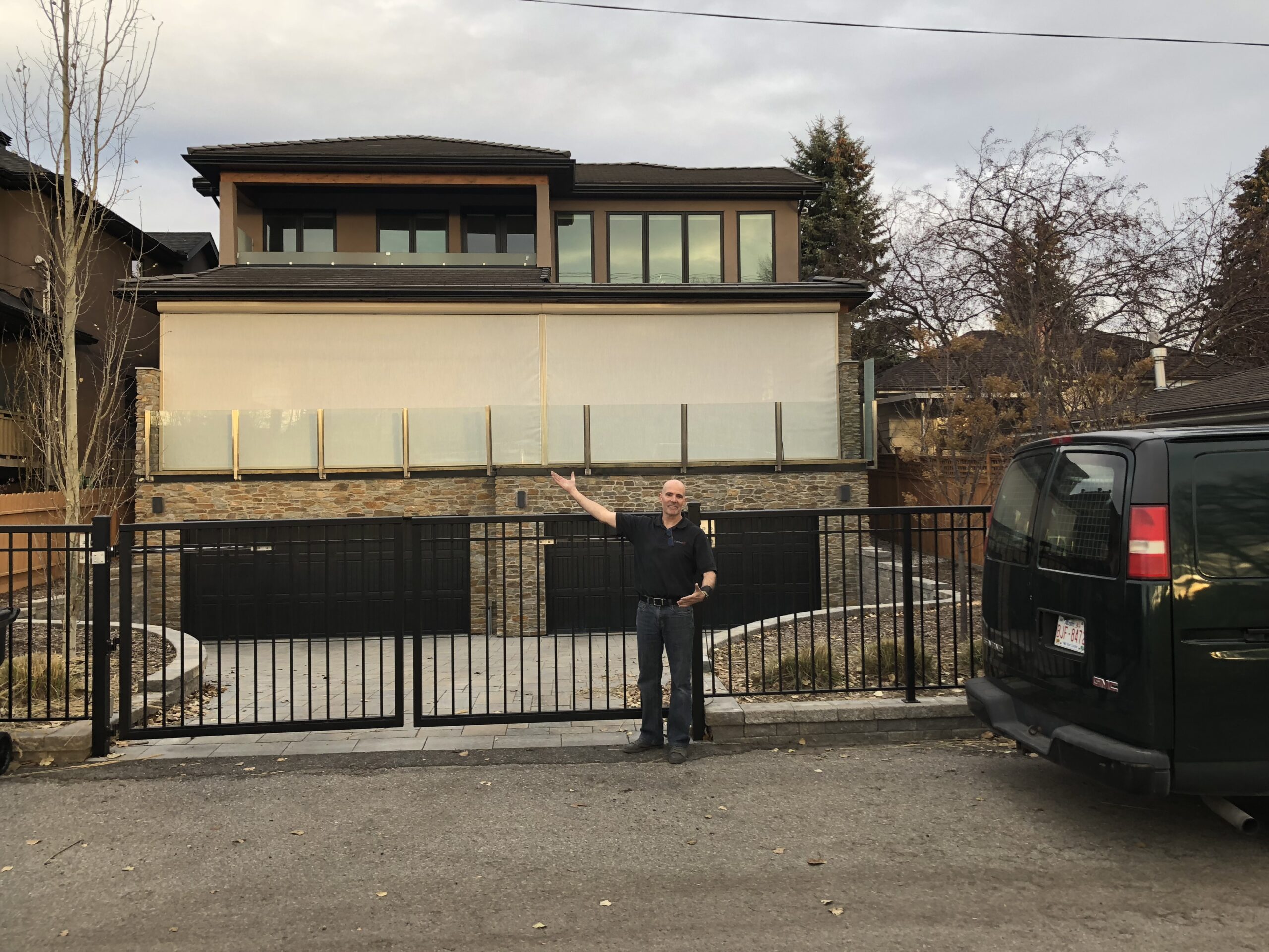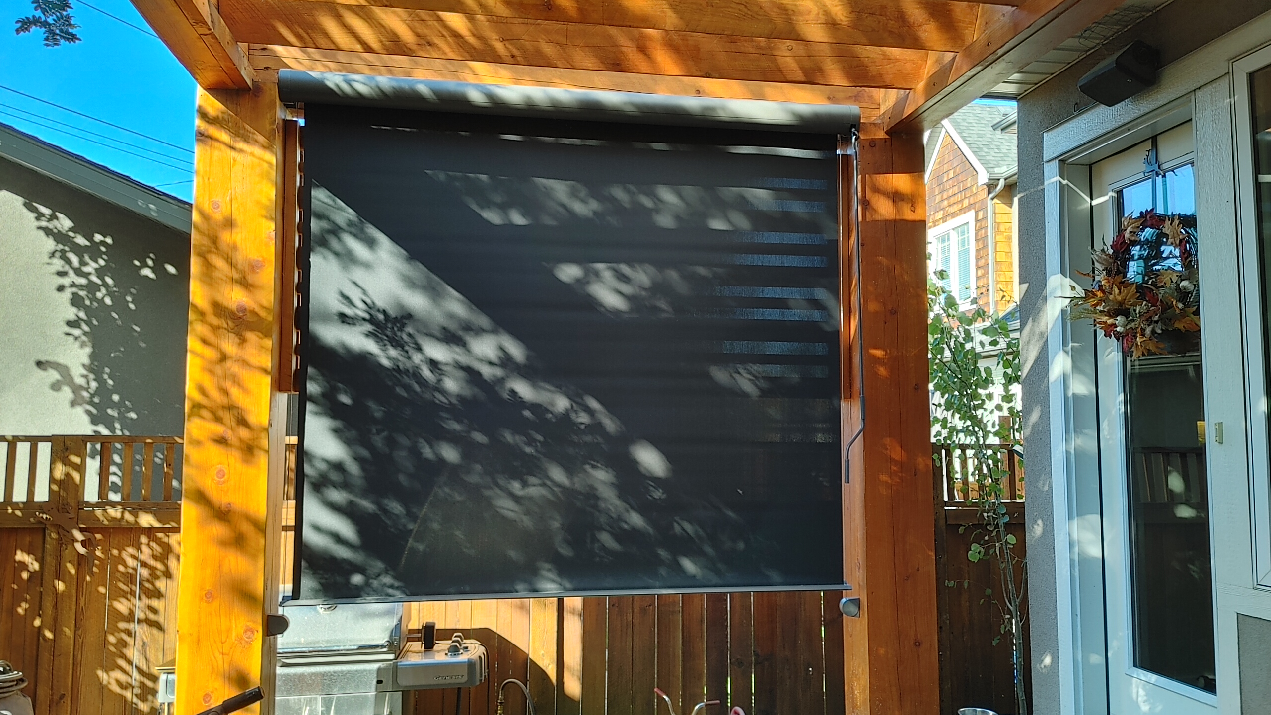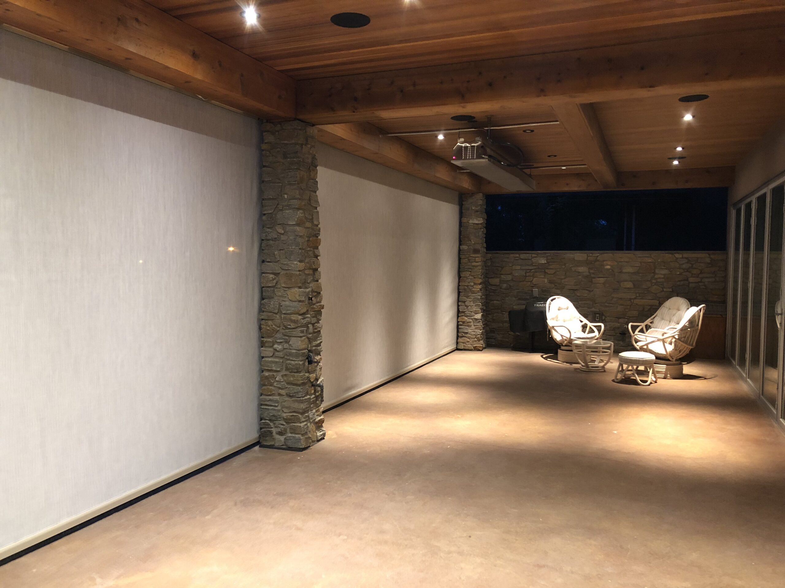 GiCor installation of motorized exterior shades used to enclose this covered patio, creating a 4 season barbeque experience.