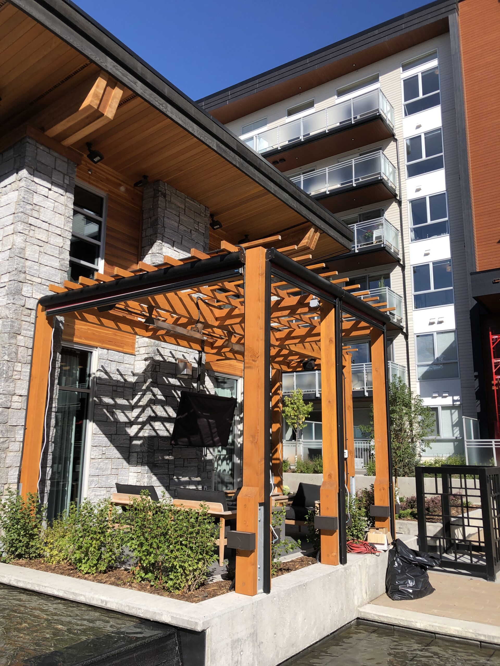 Exterior shading comes in all shapes & sizes becuase no two projects are the same. Sometimes the client has as existing wooden structure that they want us to mount to, other times they want something more decorative to provide some privacy from the neighbors however its never needed when the weather turns bad.