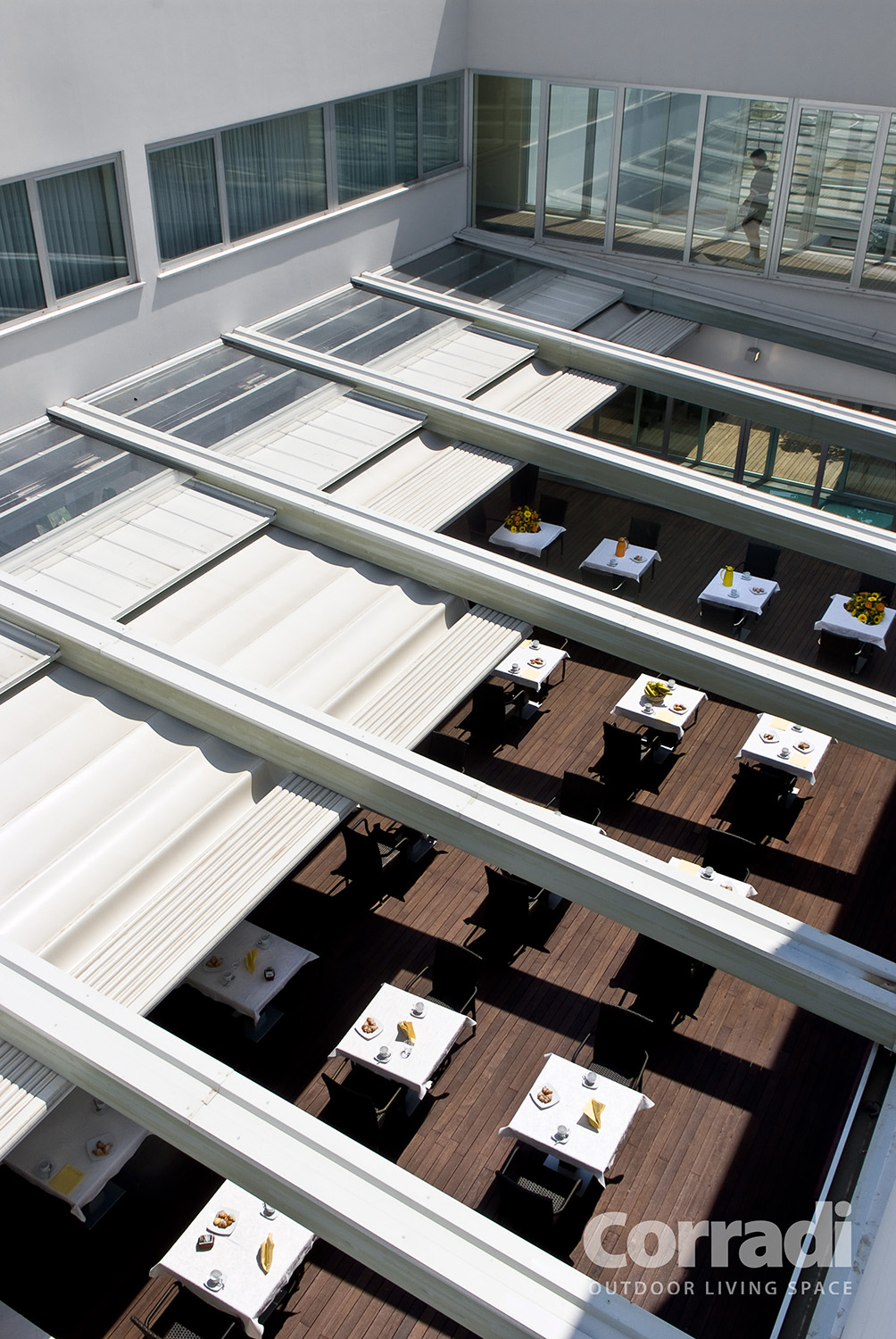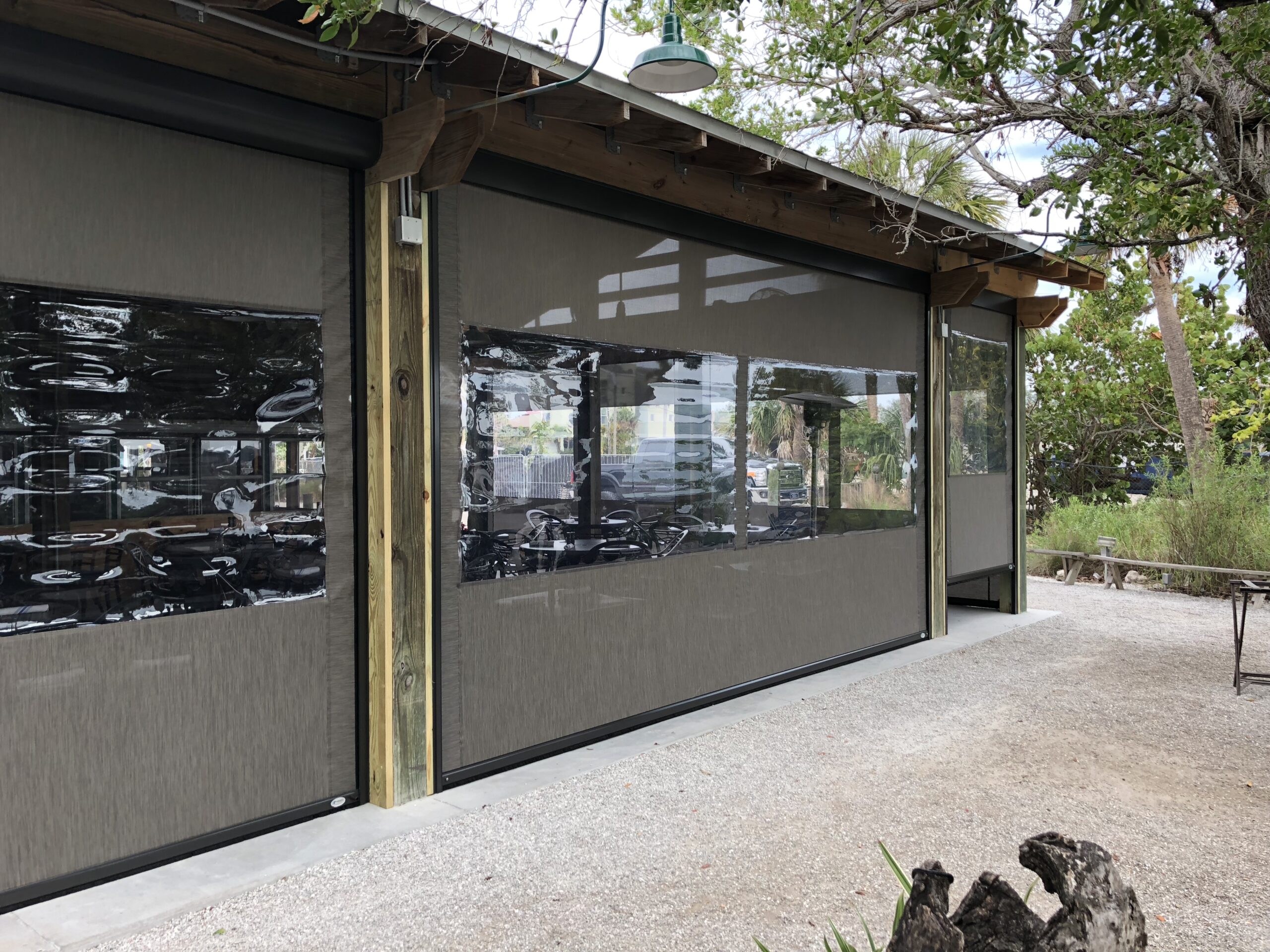 Typically the most effective and suitable product is a commercial rated roller shade combined with a perforated screen fabric. Smaller openings can be treated using light commercial shading systems that run along guide wires to keep from being damaged in the wind. Larger openings are best treated using “zipper” system and locations with higher wind should always be treated using a “keder” (welting system) within side channels to ensure the stability of the fabric, keeping edges tight and within the guide channels for year round usage.