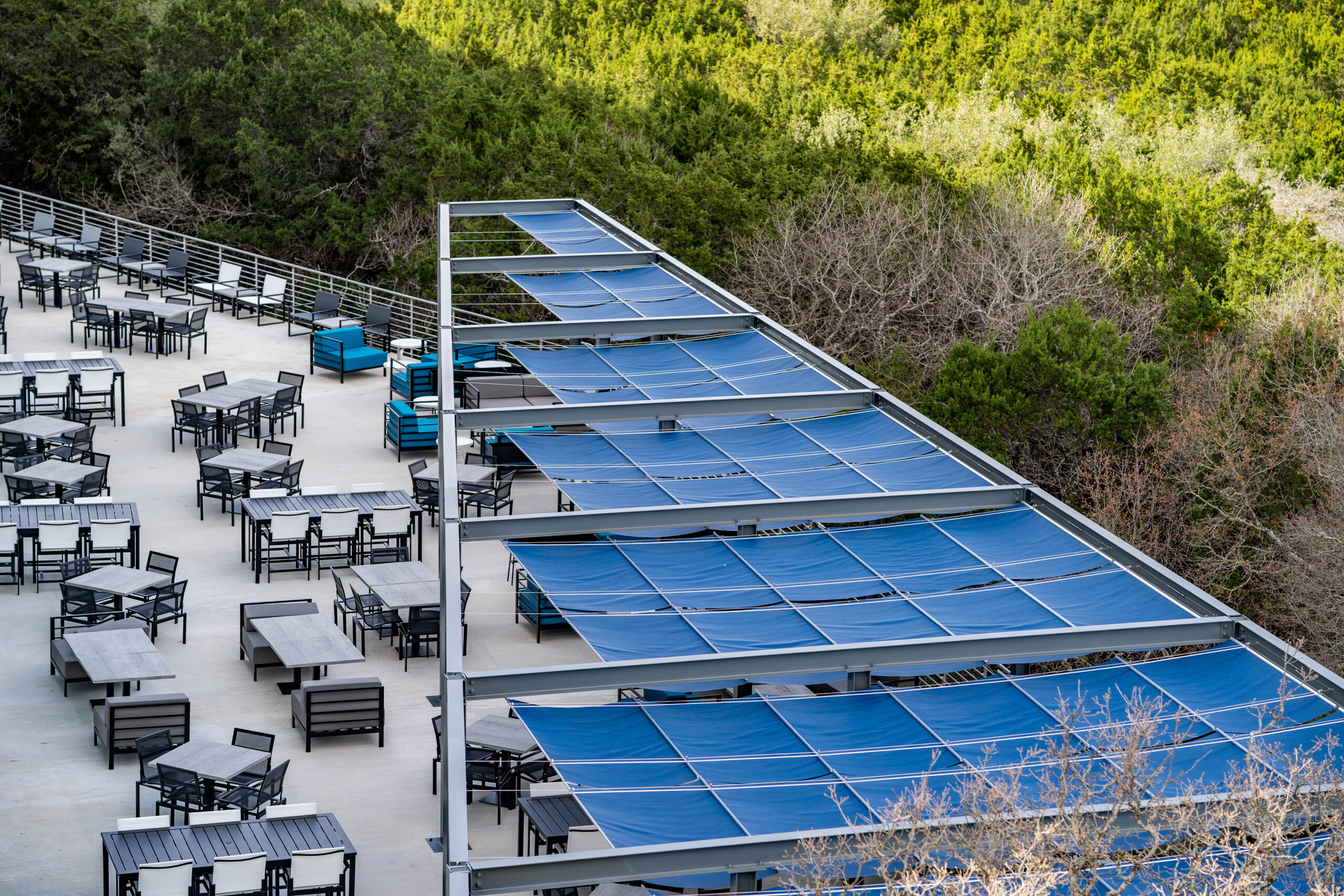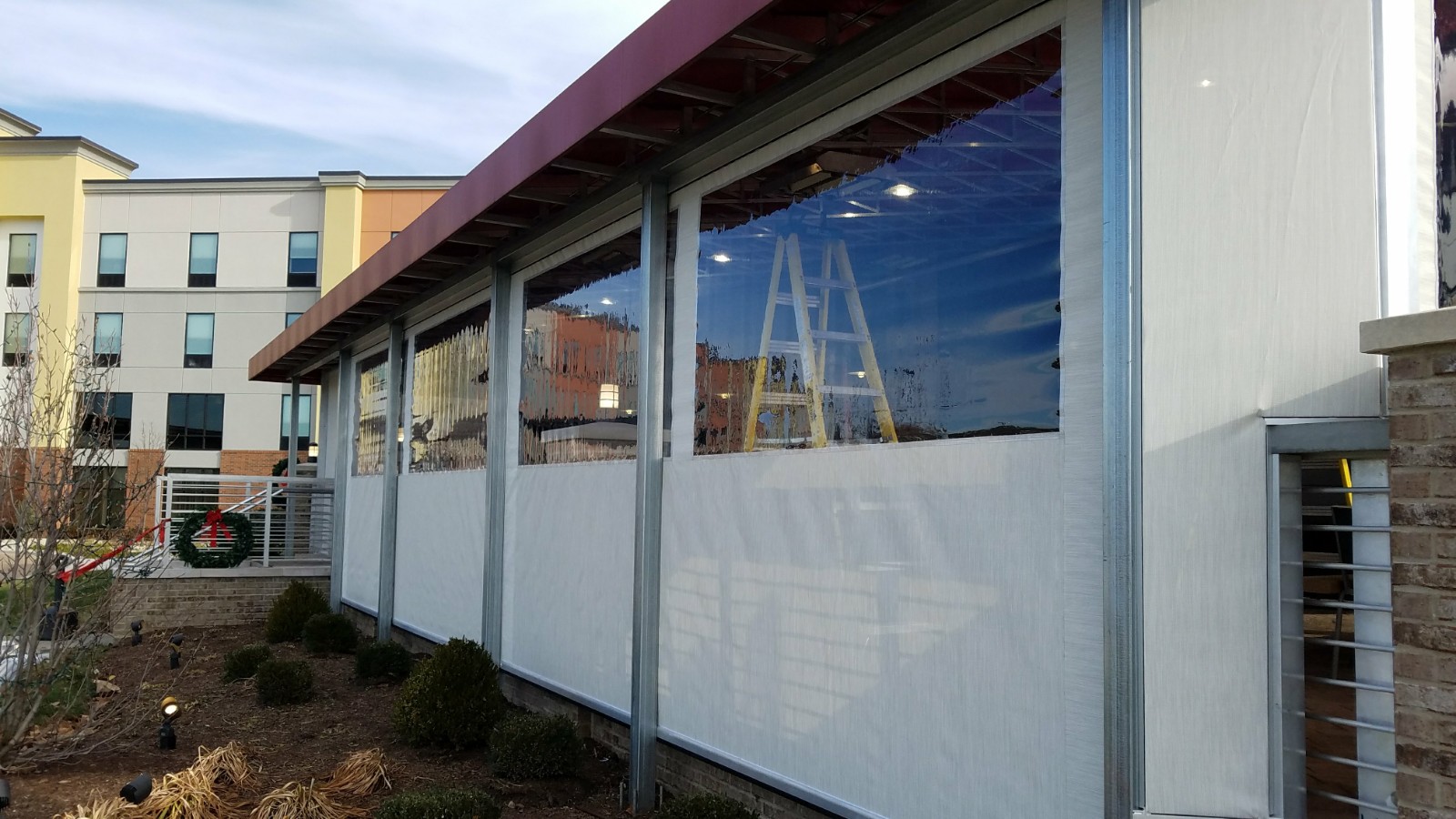 GiCor installation of exterior shades creating privacy for the cigar lounge patio at Chairmen’s Steak House