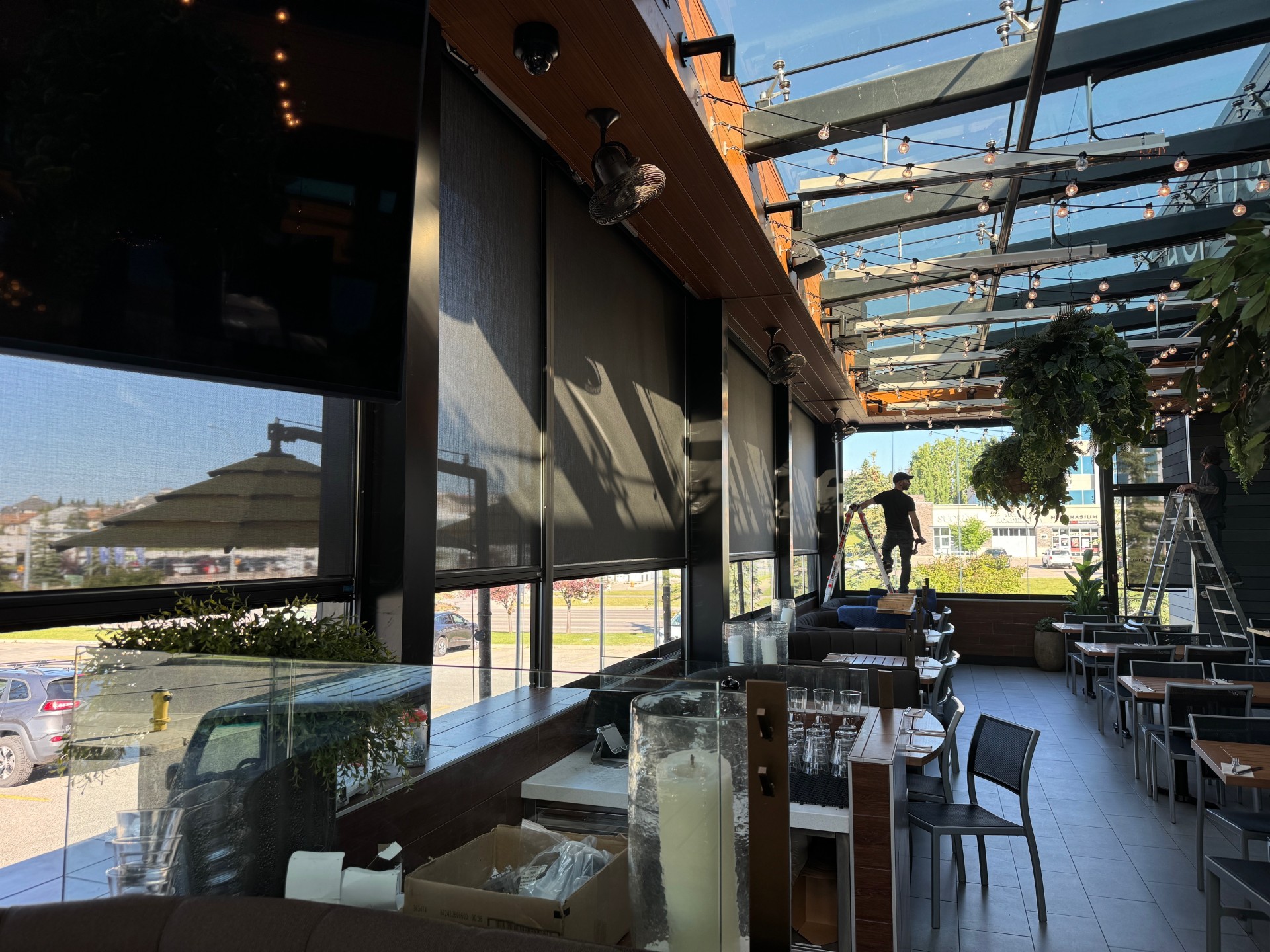 Interior / exterior shading install at Cactus Club Crowfoot in Calgary. Corradi summit shades installed inside existing shade pockets. in front of sliding glass walls make this the perfect summer dining experience!