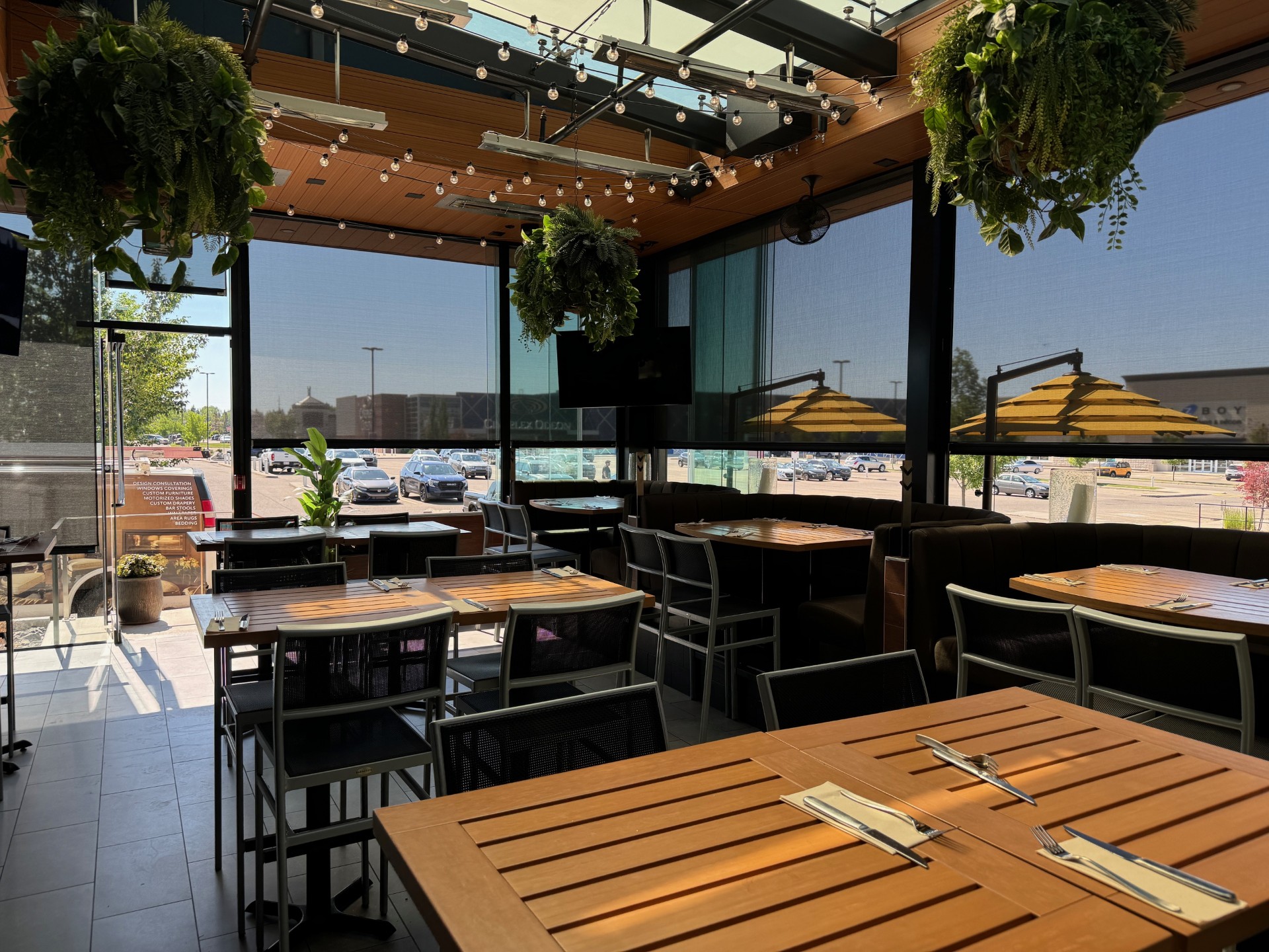 Interior / exterior shading install at Cactus Club West Edmonton Mall. Magnatrack motorized patio shades installed in front of sliding glass walls creating an oasis dining experience.