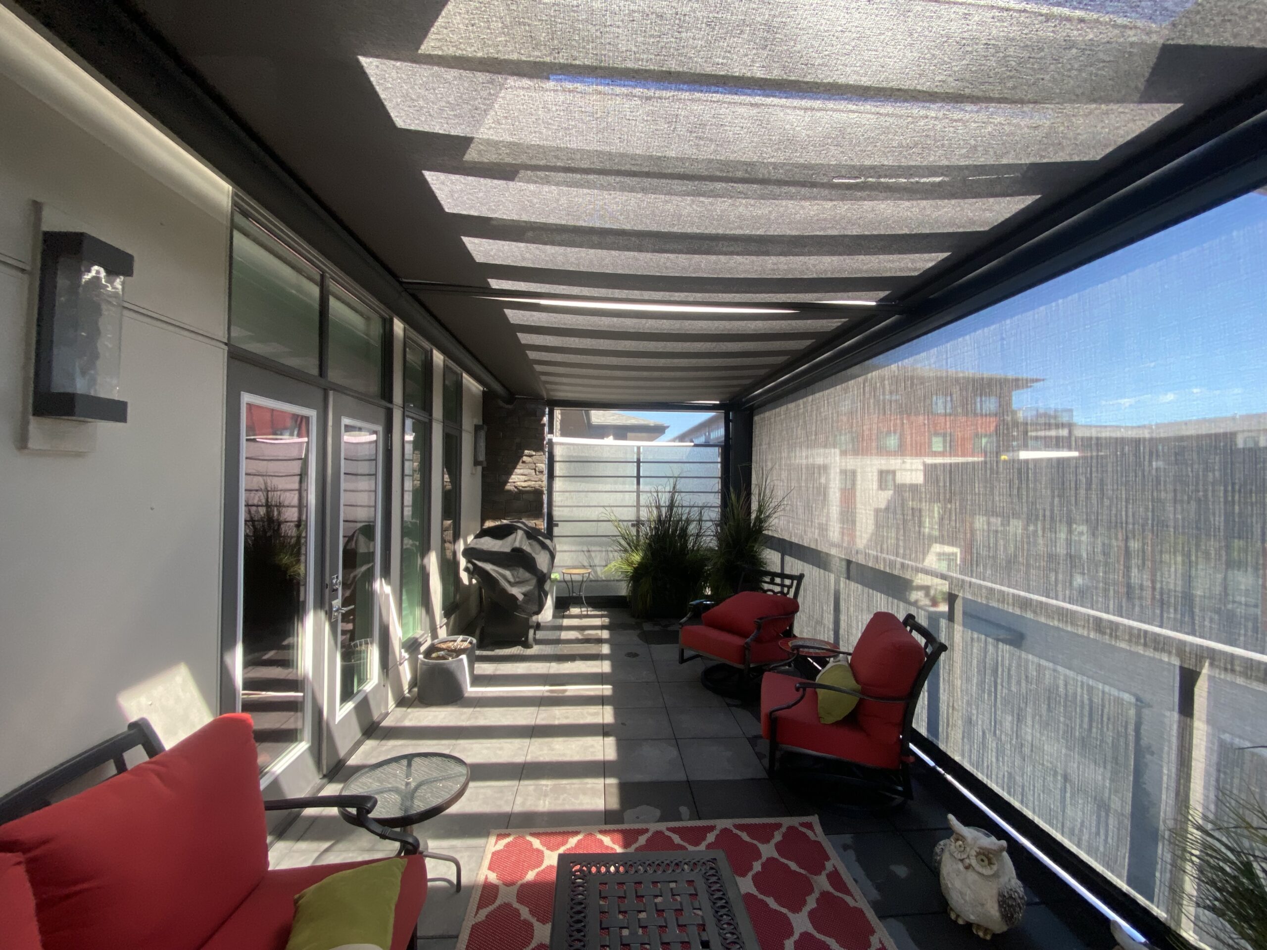 Controls options can be either manual crank OR the more preferred method using electronic shading motors. This option includes obstacle detection features and a variety of technologies that allow for control via remotes, switches, smart phones, home automation & of course voice control. , Other options include sun / heat sensors to automatically lower shades at a specified threshold in order to maintain a consistent temperature inside and out. Wind sensors can also be added to retract the shades in high wind conditions at a moment’s notice. Power options include low voltage, line voltage and now “SOLAR” for even the largest of openings.